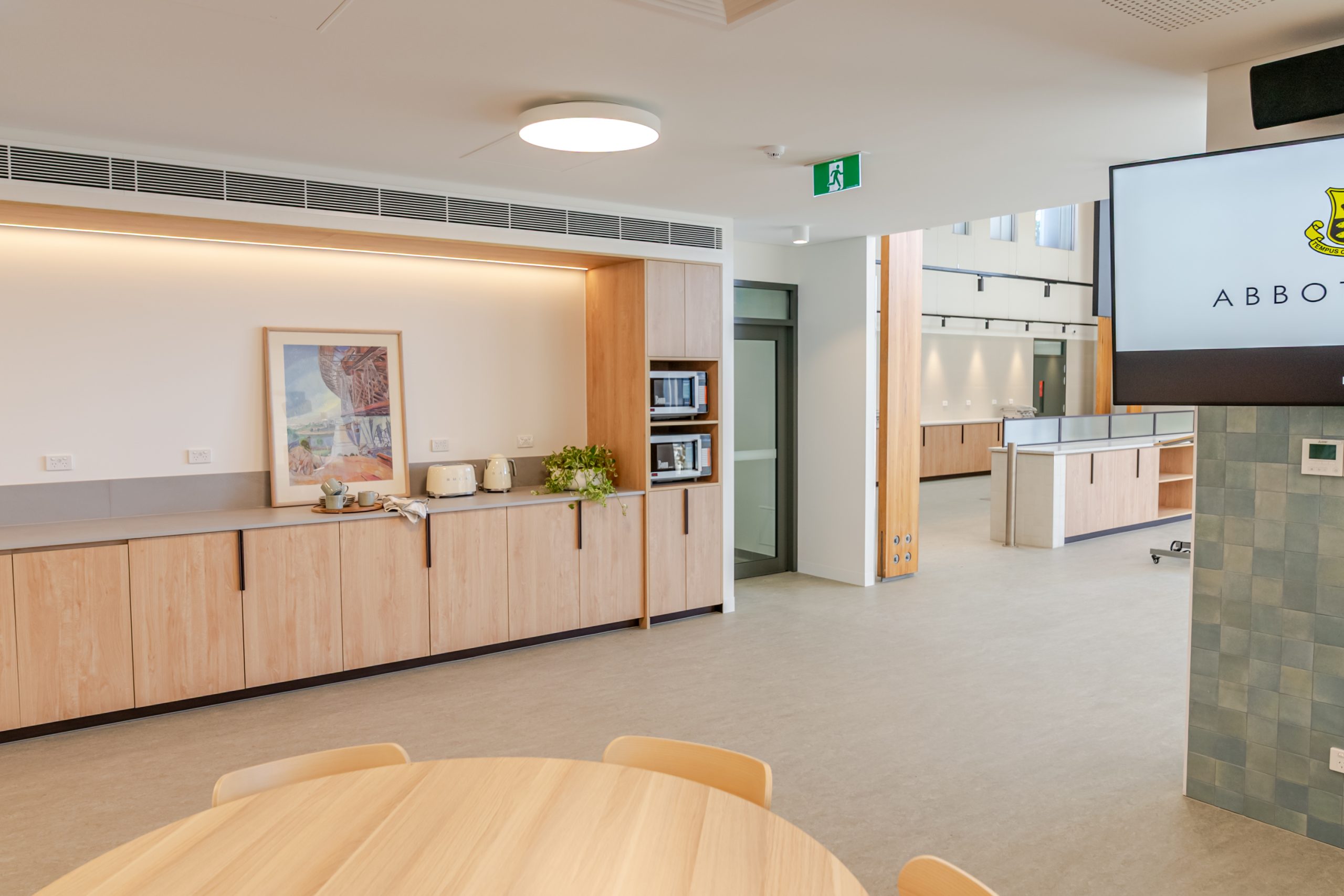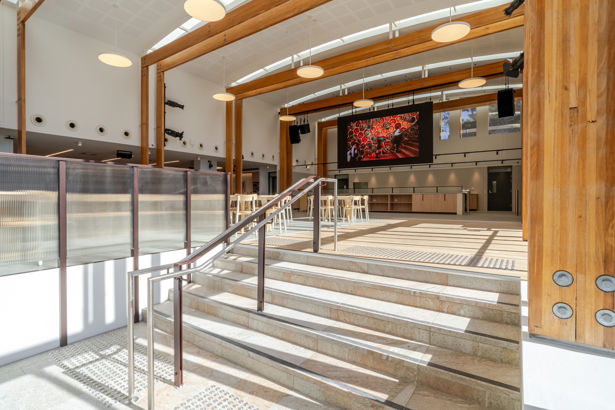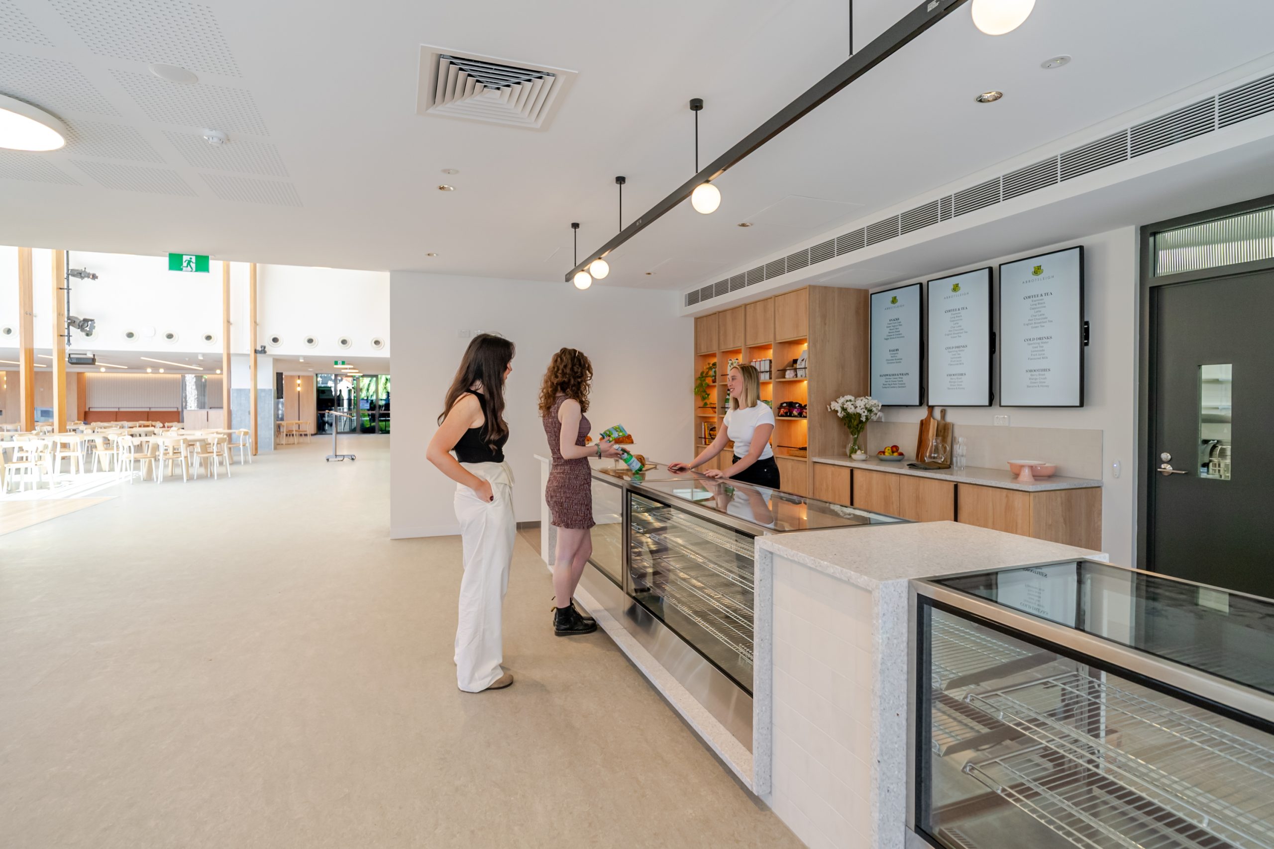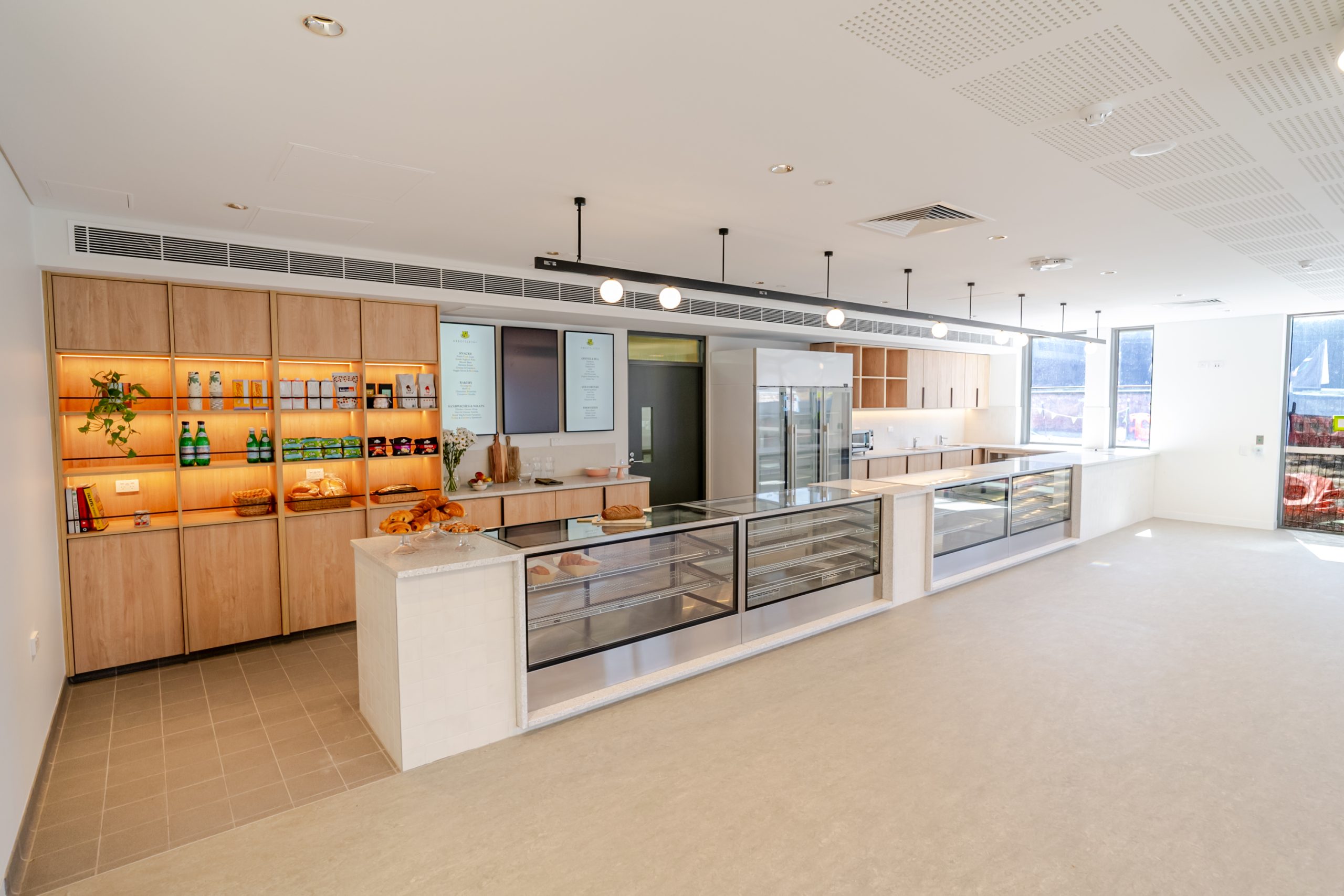 Level 2 was also refurbished to provide a new commercial kitchen, servery, café, lounge, dry store, cool room, freezer, dish drop, office, amenities and entry / common areas. New metal roofing and façade openings, doors and glazing elements was also provided.