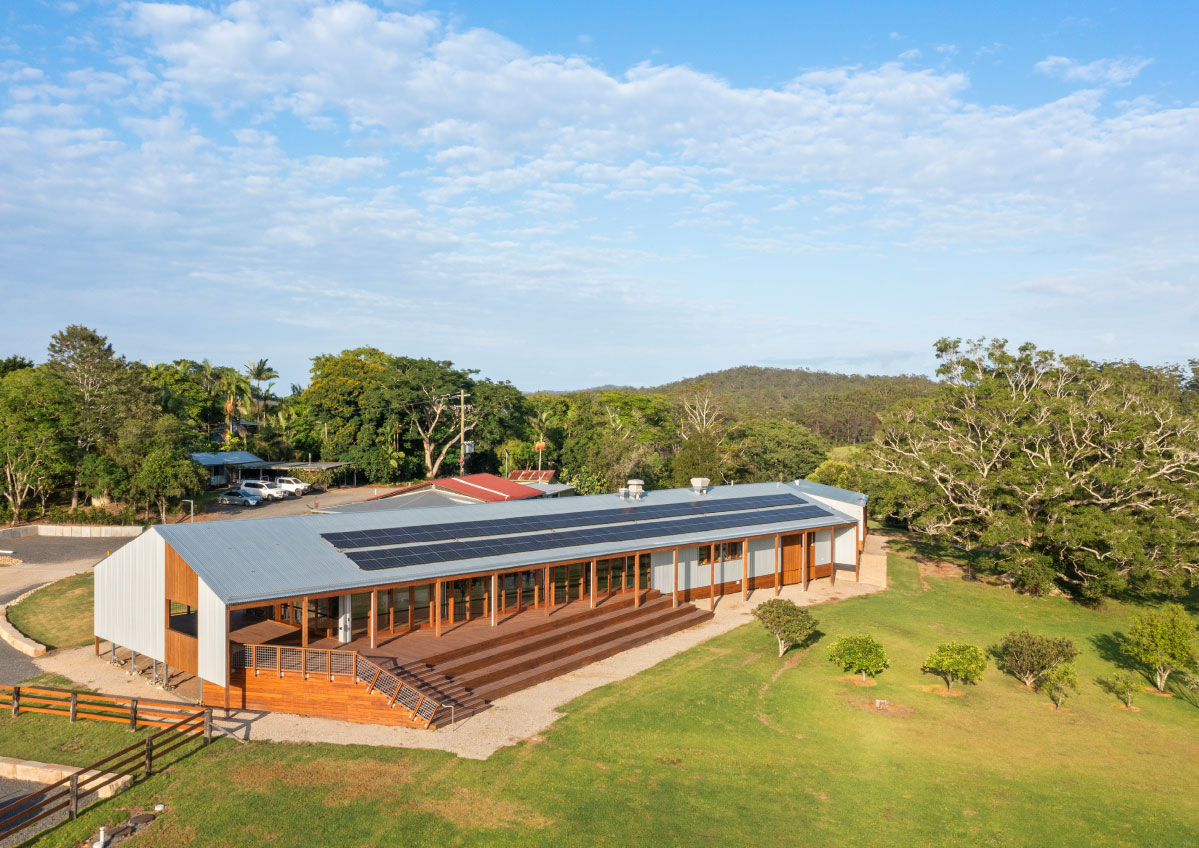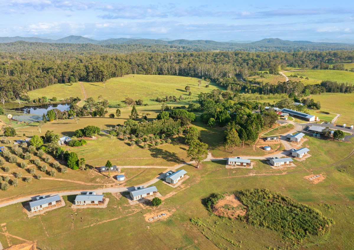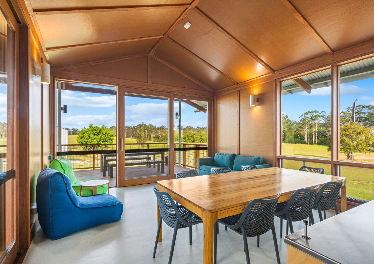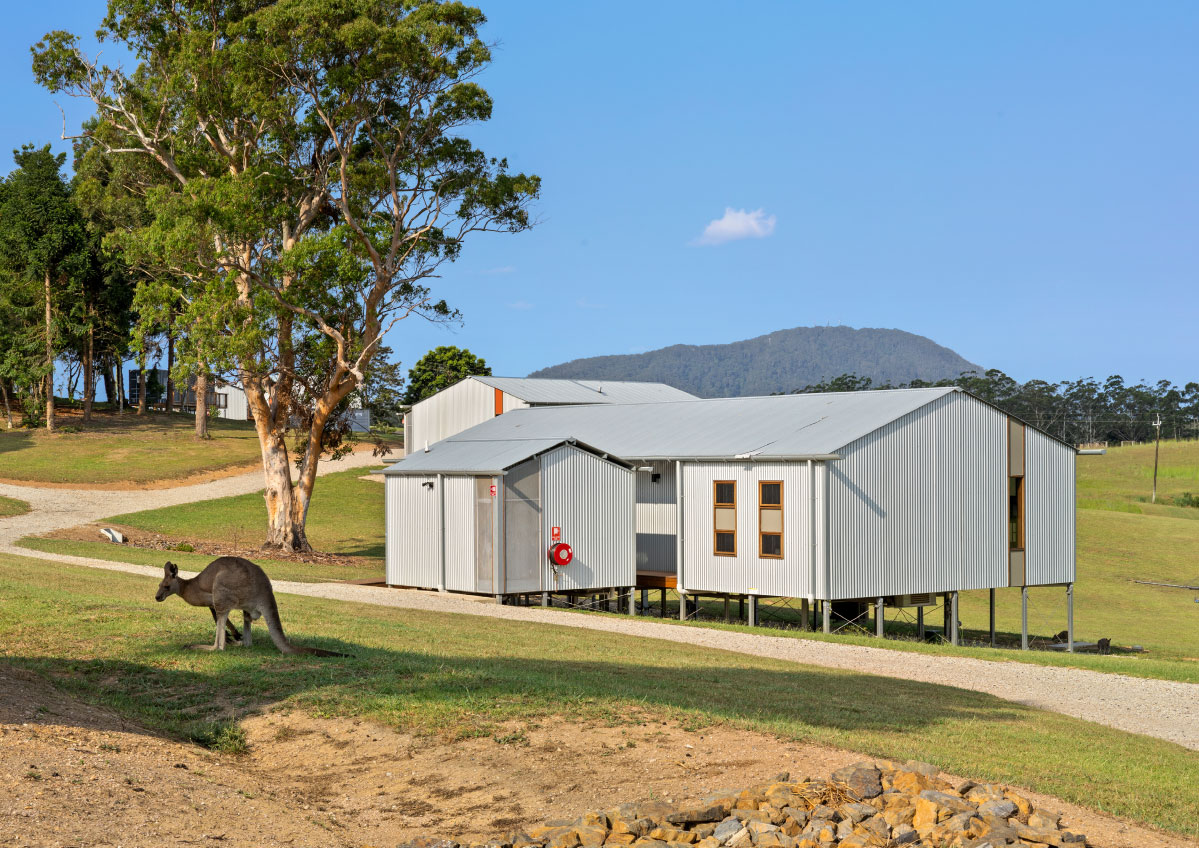 In addition to the library refurbishment, the broader campus development involved the masterplanning and architectural design of ten new buildings: eight accommodation cabins, a dining hall, and a reception building arranged along the natural contours of the site. Anchored by a majestic ancient fig tree and oriented toward Mount Yarrahapinni, these buildings work together to create a calm, cohesive setting that supports the campus’s educational and community‑centred purpose.