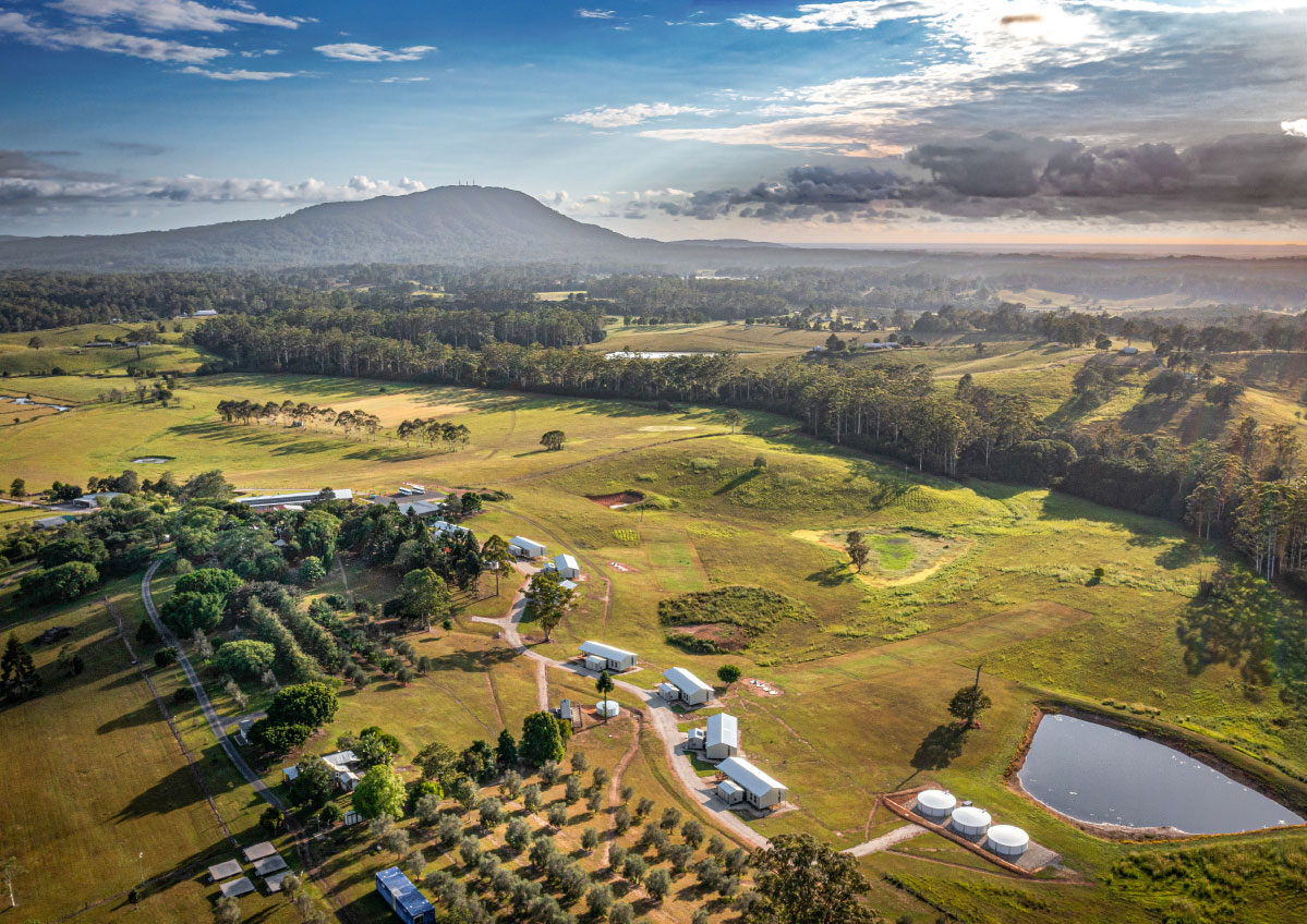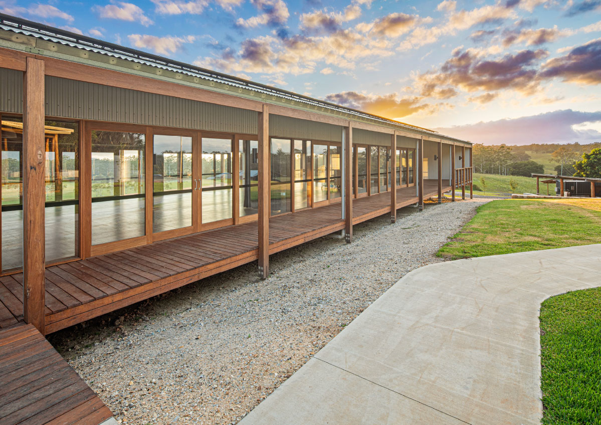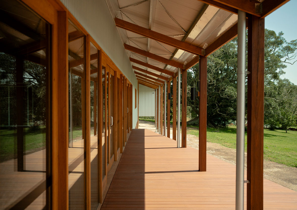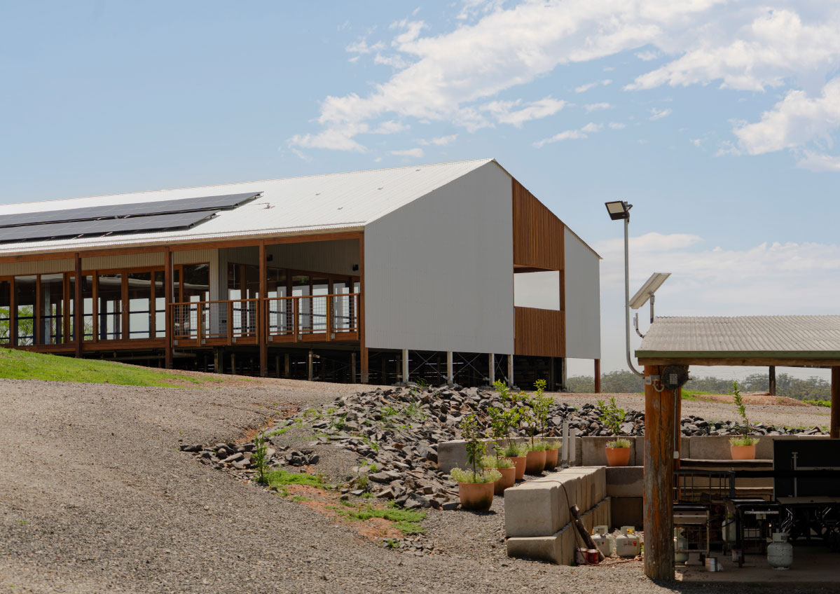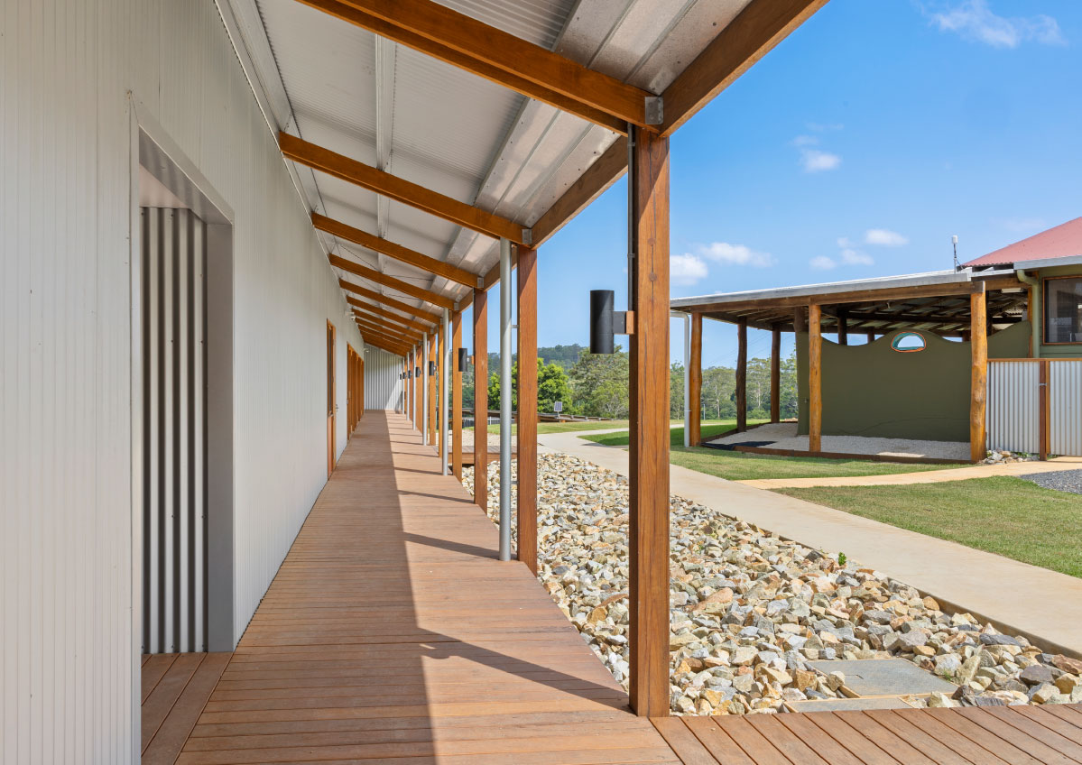 In addition to the library refurbishment, the broader campus development involved the masterplanning and architectural design of ten new buildings: eight accommodation cabins, a dining hall, and a reception building arranged along the natural contours of the site. Anchored by a majestic ancient fig tree and oriented toward Mount Yarrahapinni, these buildings work together to create a calm, cohesive setting that supports the campus’s educational and community‑centred purpose.