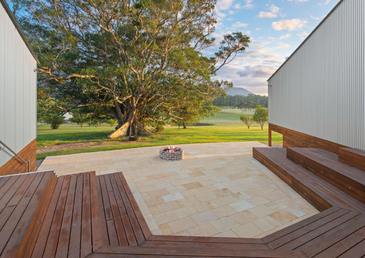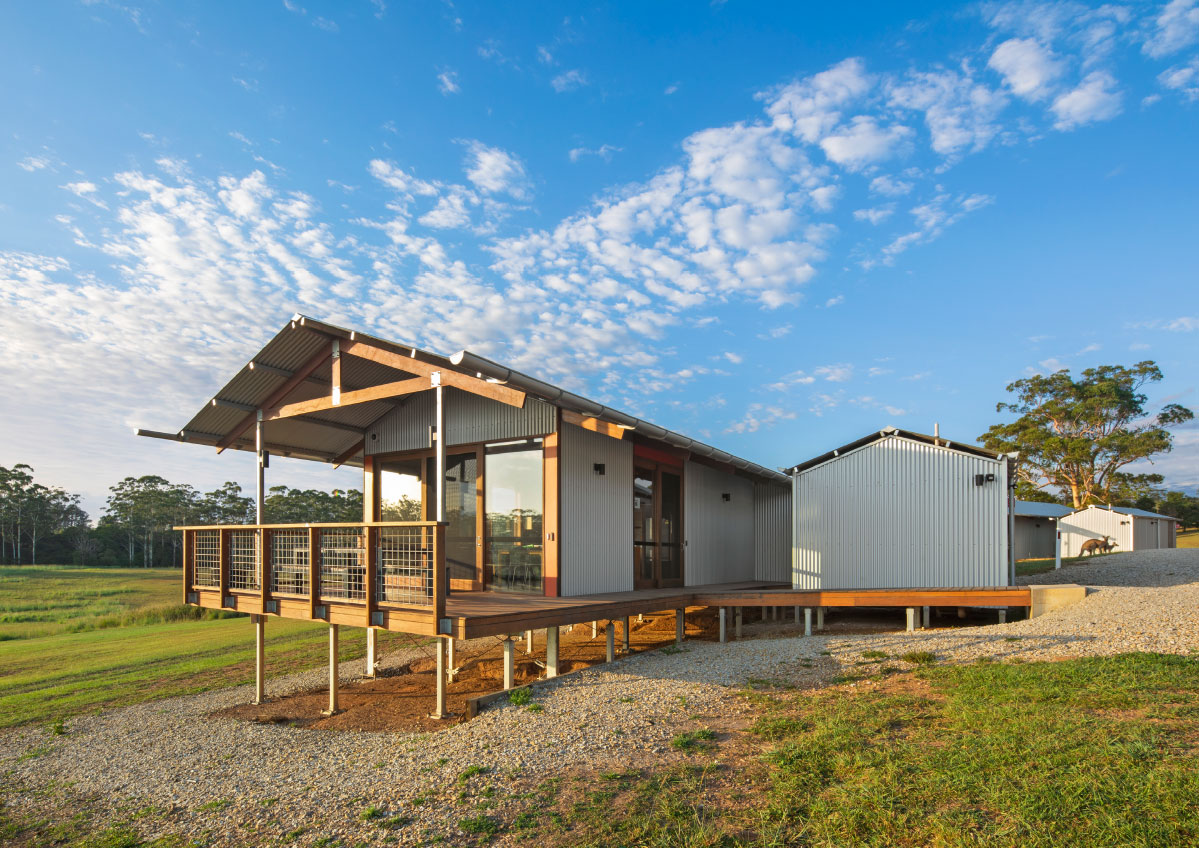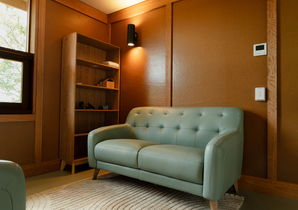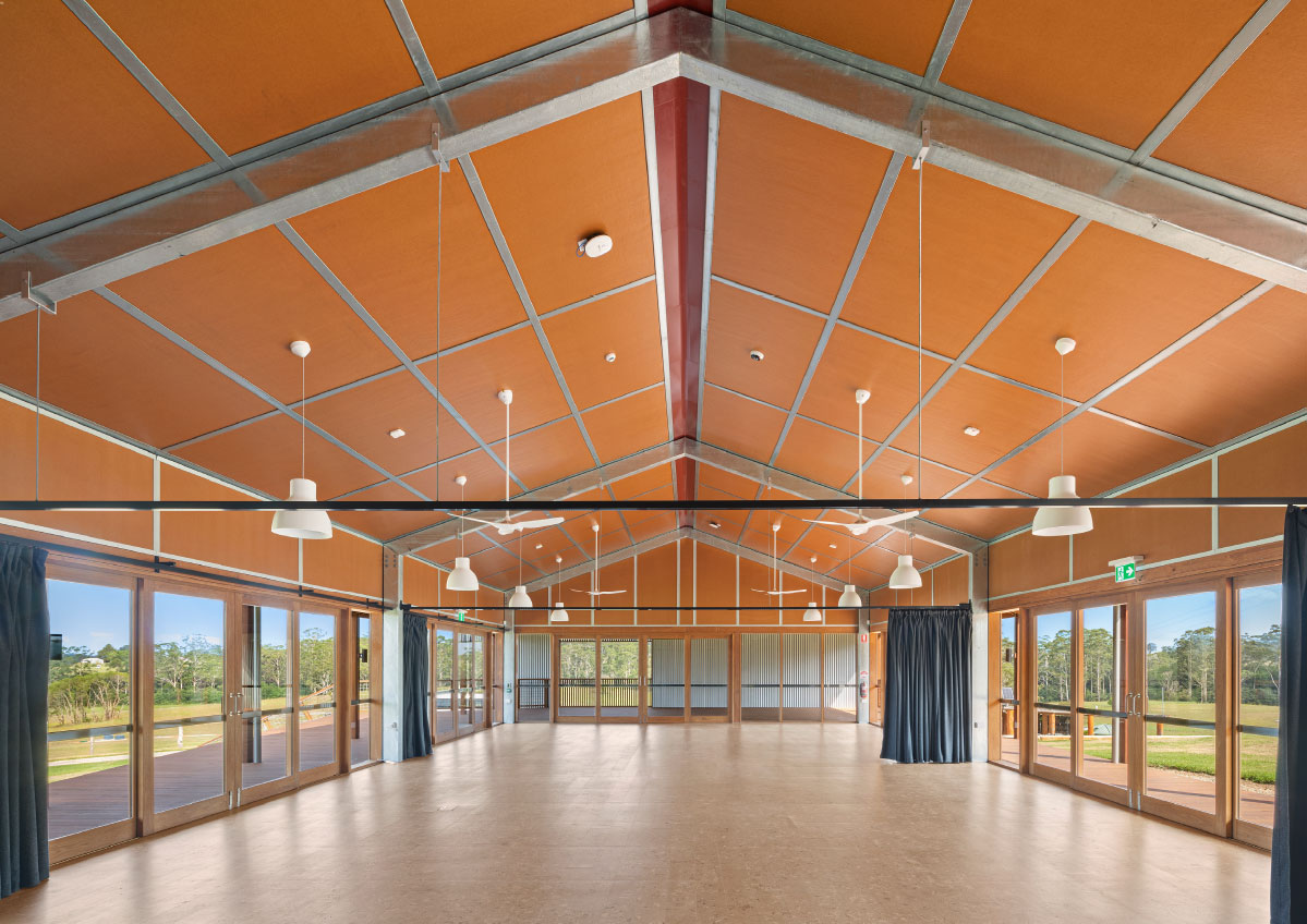 In addition to the library refurbishment, the broader campus development involved the masterplanning and architectural design of ten new buildings: eight accommodation cabins, a dining hall, and a reception building arranged along the natural contours of the site. Anchored by a majestic ancient fig tree and oriented toward Mount Yarrahapinni, these buildings work together to create a calm, cohesive setting that supports the campus’s educational and community‑centred purpose.